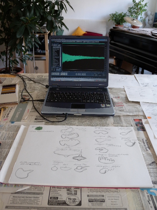 Wiederum hörte ich die Klangordner durch und zeichnete mir die Formen auf, schrieb die Größenangaben dazu. Die Formen bilden dreidimensionale Skulpturen im Raum.
